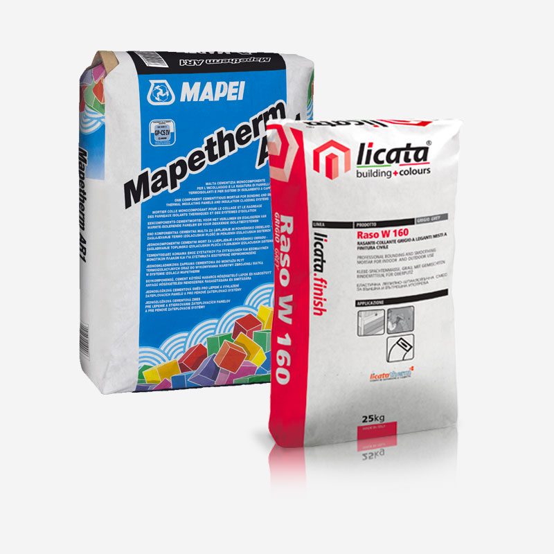 Malta cementizia monocomponente per l’incollaggio e la rasatura di pannelli termoisolanti e per sistemi di isolamento a cappotto.